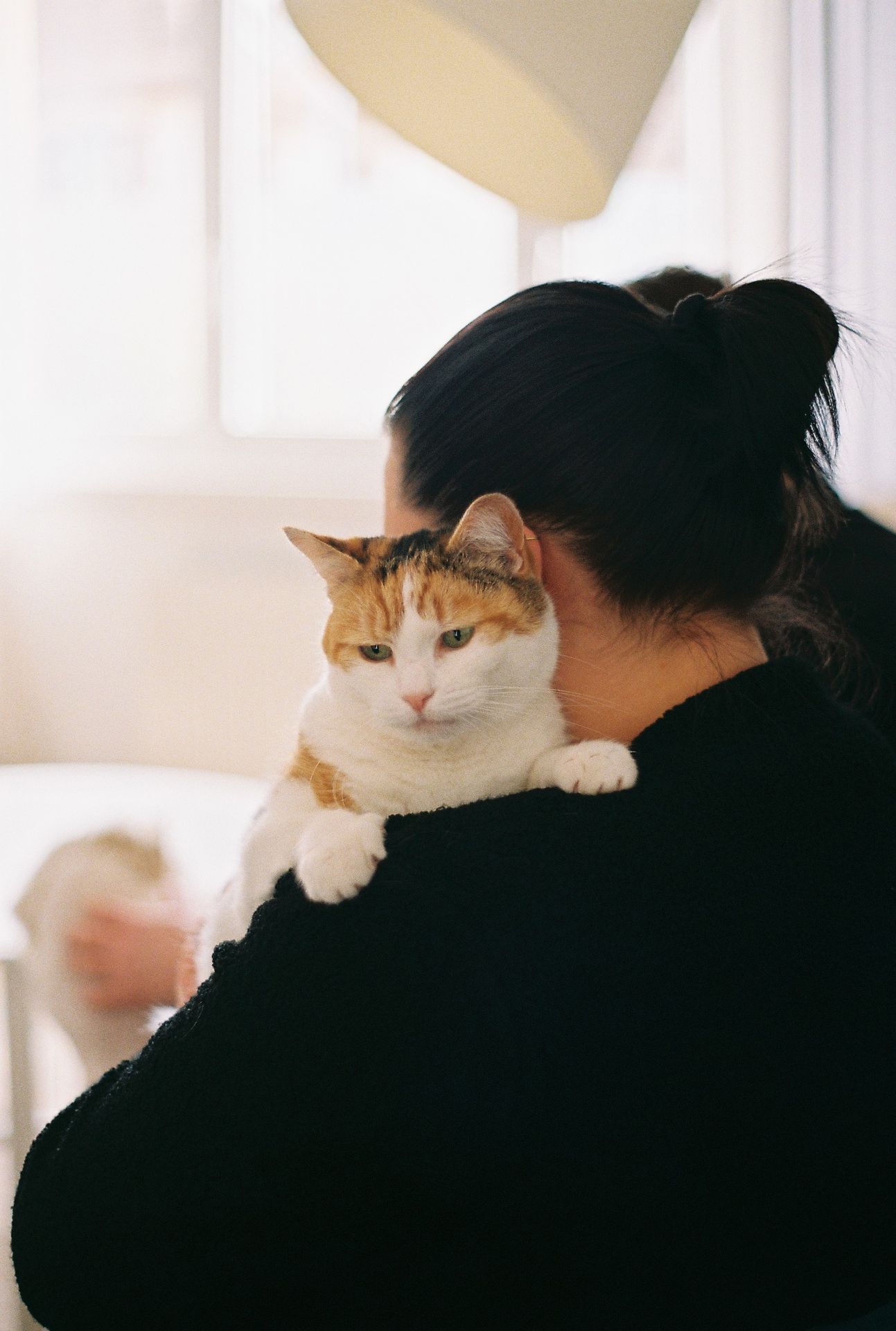 Un espace entièrement aménagé pour les félins, avec plateformes, espaces en hauteurs, cachettes, gamelles ludiques, petit espace canapé confort (bon, c'est aussi pour les humains), visibilité sur la cathédrale depuis la fenêtre (ou plutôt sur les oiseaux du jardin), arbres à chat et il y a même de quoi se réchauffer le popotin près du radiateur.